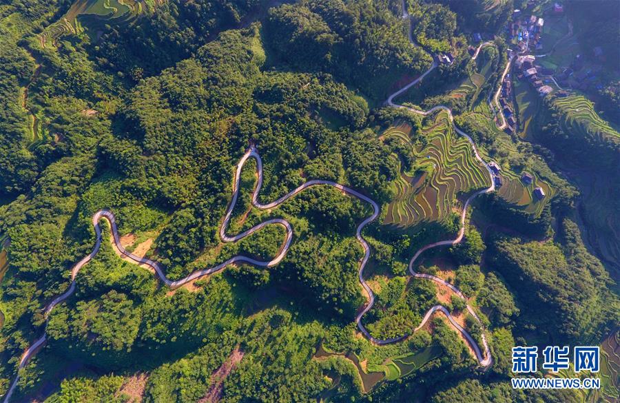 這是融水苗族自治縣桿洞鄉(xiāng)百秀村的村屯公路(6月20日無(wú)人機(jī)拍攝)。新華社記者黃孝邦攝