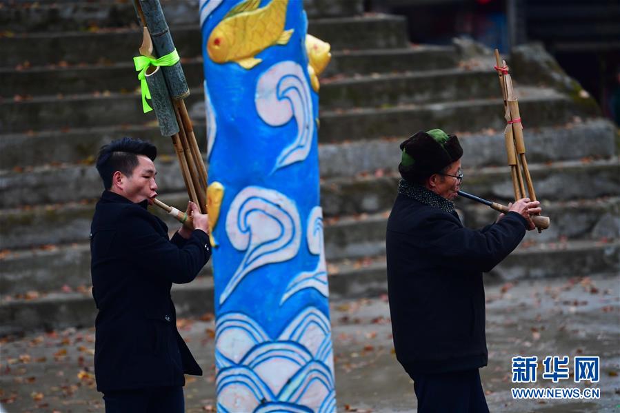 在烏英苗寨新蘆笙柱下,融水苗族自治縣苗族蘆笙音樂(lè)代表性傳承人梁安合(中)在練習(xí)吹蘆笙(12月24日攝)。新華社記者王諾攝