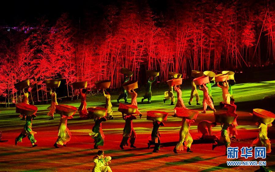 12月30日,演員在武夷山表演《印象大紅袍》。當日,福建武夷山“印象大紅袍十周年公益晚會”在風光秀麗的大王峰下舉行?!队∠蟠蠹t袍》《印象劉三姐》《印象麗江》《又見平遙》《印象武隆》《印象西湖》六部“印象家族”作品同臺亮相。這場公益晚會票房收入將全部捐獻給南平市紅十字會,用于資助閩北山區(qū)貧困家庭。  新華社記者 張國俊 攝