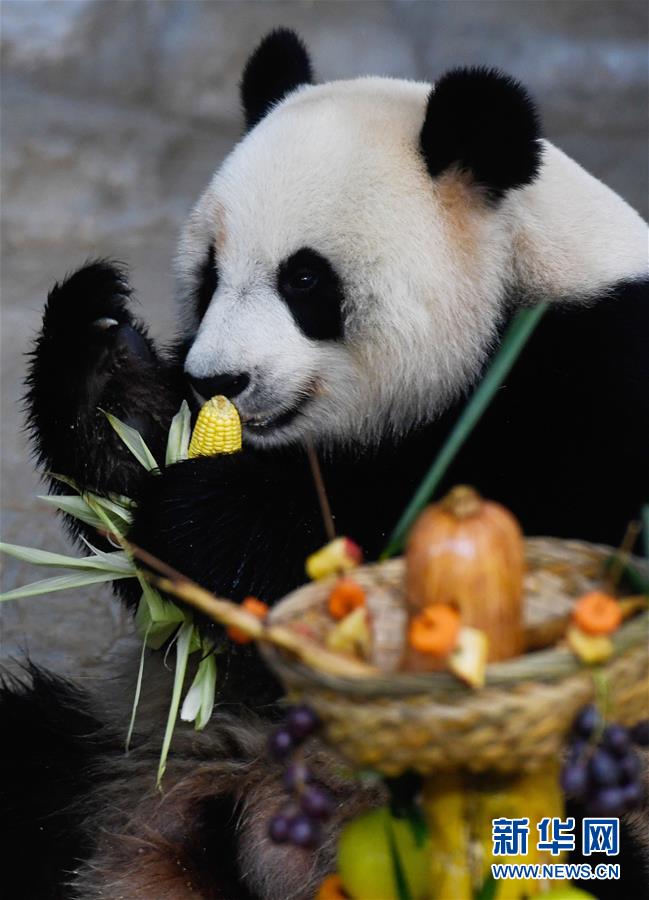 12月31日,大熊貓“貢貢”在吃玉米。  新華社記者 楊冠宇 攝