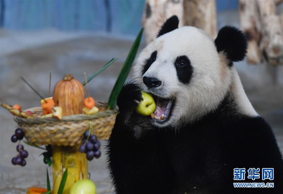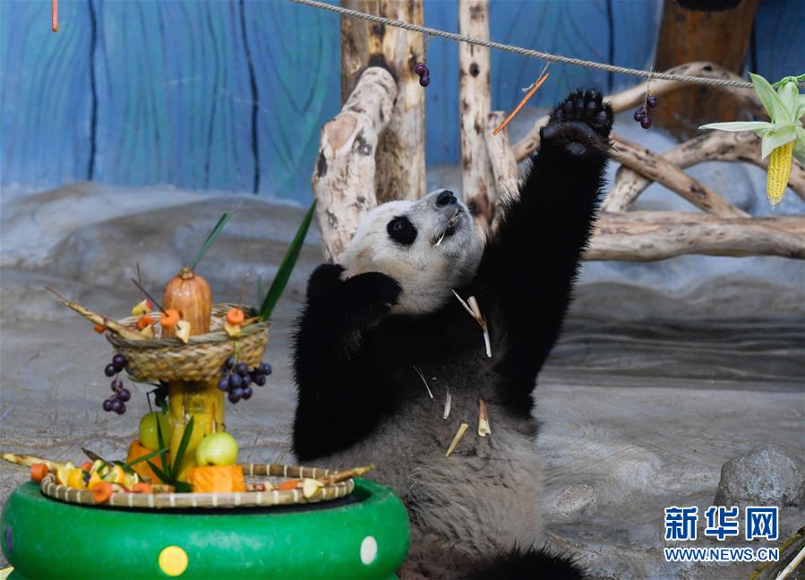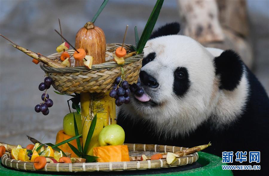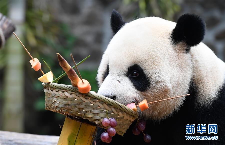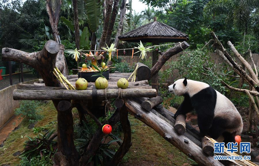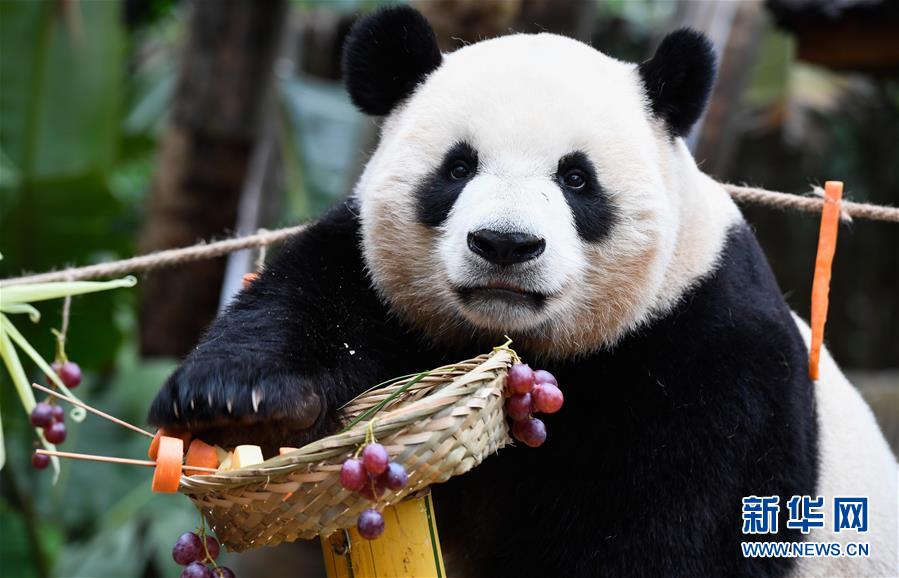 當日是2019年最后一天,海南熱帶野生動植物園的工作人員為園區(qū)內(nèi)大熊貓“貢貢”“舜舜”準備了用葡萄、南瓜、竹筍等果蔬制作的“火鍋串串香”,讓它們用“擼串”的方式迎接新年的到來。 新華社記者 楊冠宇 攝