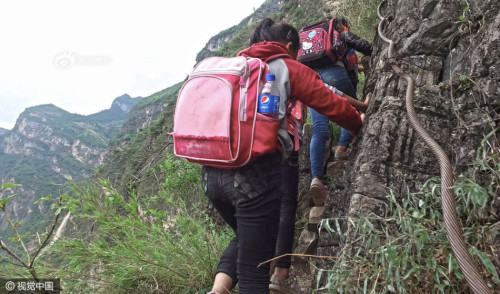 上學(xué)的孩子都背著沉沉的書包,大多數(shù)是女孩,15個(gè)孩子在三個(gè)家長(zhǎng)的保護(hù)下,大約用了2個(gè)小時(shí),到達(dá)“懸崖村”。上山容易下山難,遇到雨雪天氣,村里人就不再外出了。圖片來源:視覺中國