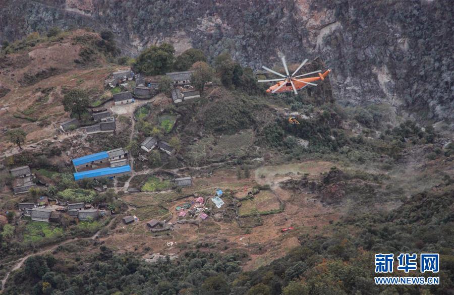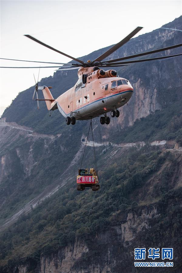 米-26重型直升機(jī)吊運(yùn)一臺(tái)挖掘機(jī)飛抵阿布洛哈村上空(2019年12月5日攝)。通村公路的施工單位四川路橋租用一架米-26重型運(yùn)輸直升機(jī),克服高山峽谷、天氣多變等不利因素,從布拖縣城吊運(yùn)大型施工設(shè)備到阿布洛哈村,為兩邊分頭掘進(jìn)施工提供大型機(jī)械保障。新華社記者江宏景攝