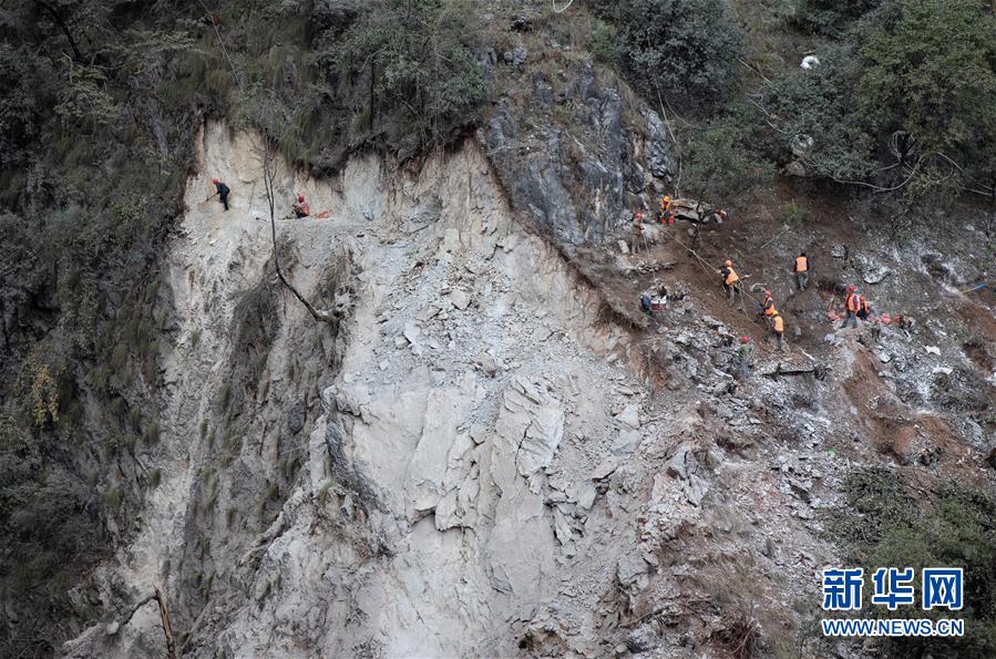 四川路橋施工隊(duì)伍在陡崖上作業(yè)(2019年11月20日攝)。阿布洛哈村通村公路施工遇到陡崖夾溝地勢(shì),項(xiàng)目進(jìn)程艱難緩慢,四川路橋施工隊(duì)伍開始在峽谷兩端分頭推進(jìn)。新華社記者江宏景攝