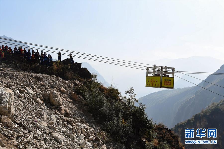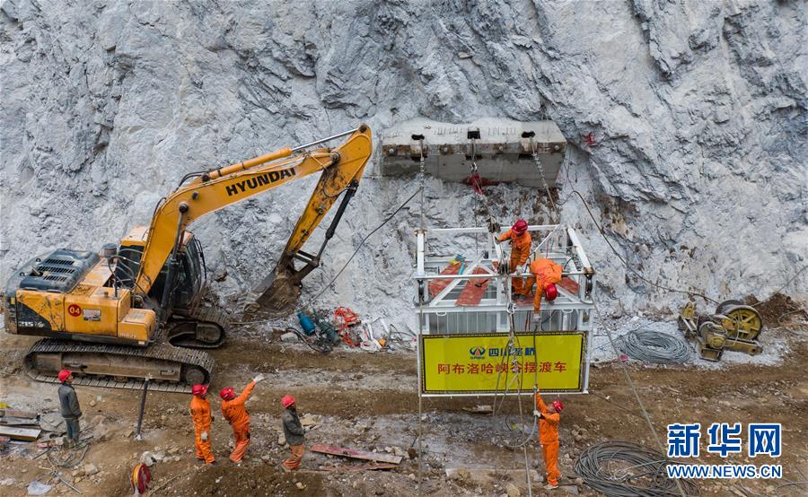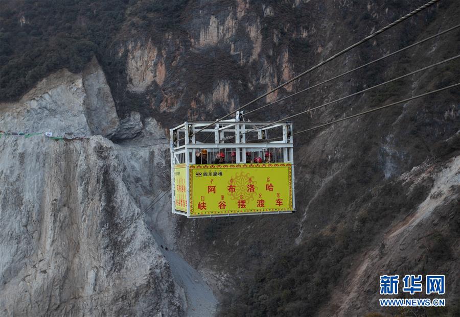 阿布洛哈擺渡車載著四川路橋的工人在峽谷兩岸運(yùn)行調(diào)試(2019年12月30日攝)。新華社記者江宏景攝