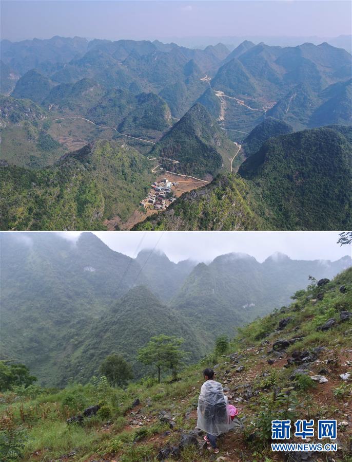 拼版照片:上圖為已經(jīng)修通公路的大化瑤族自治縣板升鄉(xiāng)弄勇村各自然屯(11月11日無人機(jī)拍攝);下圖為在弄勇村弄炮屯,一名小學(xué)生爬山路去學(xué)校(2016年9月1日攝)。新華社記者黃孝邦攝