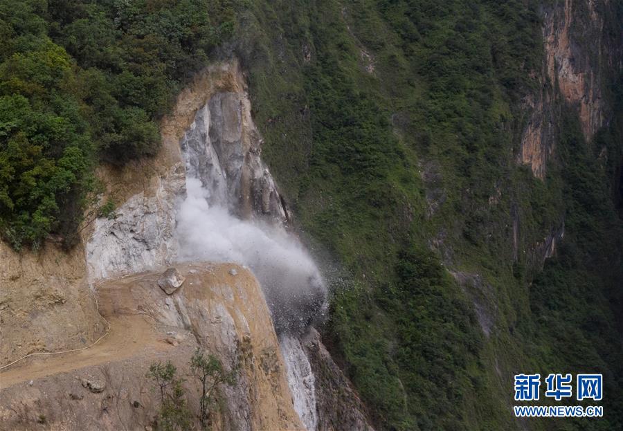 阿布洛哈村通村公路施工中進(jìn)行的一次爆破(2019年7月18日攝)。在該公路修建中遇到陡崖夾溝地勢(shì)時(shí),施工人員有時(shí)一天要進(jìn)行10余次爆破。新華社記者江宏景攝