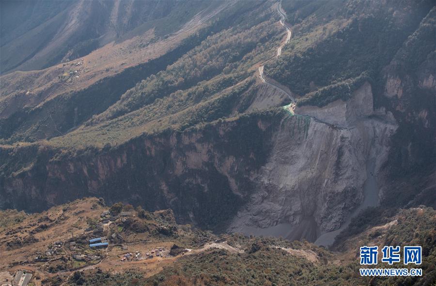 俯瞰阿布洛哈村通村公路(2019年12月27日攝)。目前公路已有近3公里鋪設(shè)完成,剩下的路段多數(shù)要在碎屑巖、變質(zhì)巖的懸崖絕壁上修建。新華社記者江宏景攝