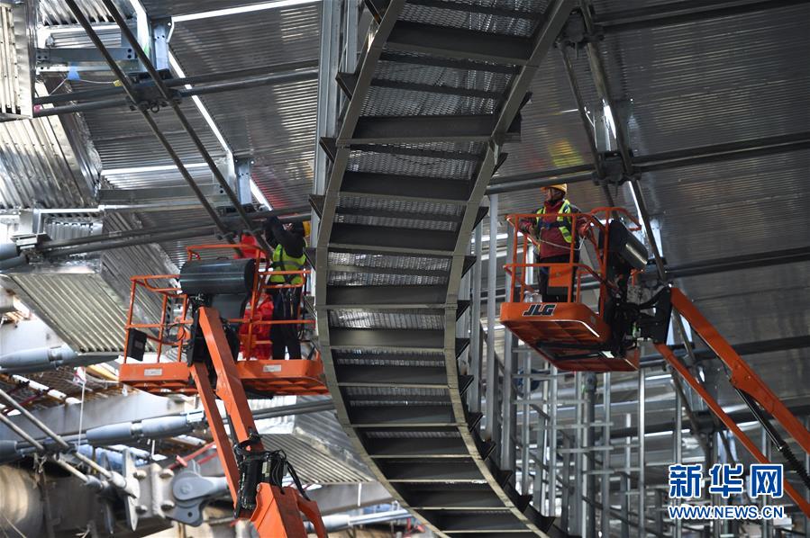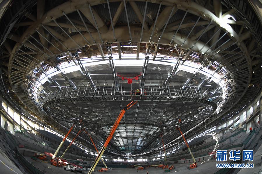 12月31日,施工人員在國家速滑館施工現(xiàn)場(chǎng)安裝最后一塊屋面單元板塊。新華社記者鞠煥宗攝