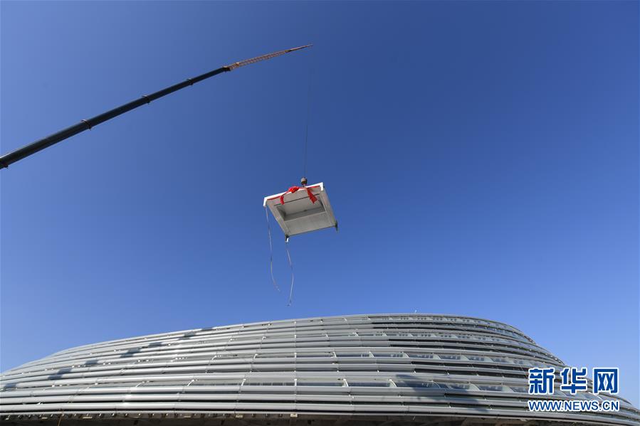 12月31日,施工人員在國家速滑館施工現(xiàn)場(chǎng)起吊最后一塊待安裝的屋面單元板塊。新華社記者鞠煥宗攝