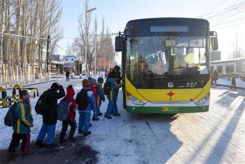 2019年12月18日,在新疆伊犁哈薩克自治州察布查爾錫伯自治縣海努克鄉(xiāng)阿熱吾斯塘村小學(xué),學(xué)生排隊(duì)登上“校車(chē)專(zhuān)線”。新華社記者丁磊攝