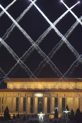 2019年10月1日,慶祝中華人民共和國(guó)成立70周年大會(huì)在北京天安門(mén)廣場(chǎng)隆重舉行。這是空中梯隊(duì)飛過(guò)天安門(mén)上空。新華社記者金良快攝