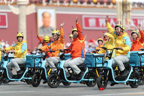 2019年10月1日,慶祝中華人民共和國(guó)成立70周年大會(huì)在北京天安門(mén)廣場(chǎng)隆重舉行。這是群眾游行中的與時(shí)俱進(jìn)方陣。新華社記者歐東衢攝