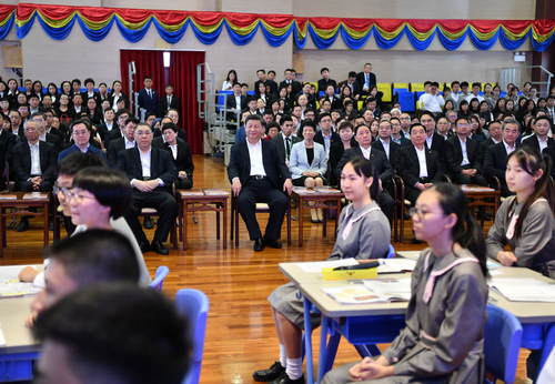 2019年12月19日,國(guó)家主席習(xí)近平在澳門(mén)特別行政區(qū)行政長(zhǎng)官崔世安陪同下,來(lái)到位于澳門(mén)黑沙環(huán)的政府綜合服務(wù)中心和濠江中學(xué)附屬英才學(xué)校,同澳門(mén)市民和師生親切交流。這是習(xí)近平在濠江中學(xué)附屬英才學(xué)校觀摩以“‘一國(guó)兩制’與澳門(mén)”為題的中國(guó)歷史公開(kāi)課。新華社記者李濤攝