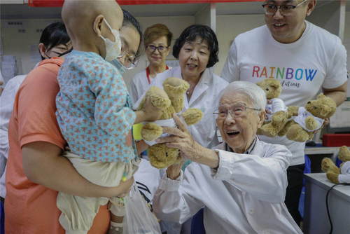 2019年5月31日,北京兒童醫(yī)院百歲兒科醫(yī)生張金哲(前右)在北京關(guān)愛(ài)惡性實(shí)體腫瘤患兒公益活動(dòng)上向住院的孩子贈(zèng)送兒童節(jié)禮物。新華社記者張玉薇攝