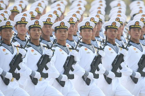 2019年10月1日,慶祝中華人民共和國(guó)成立70周年大會(huì)在北京天安門(mén)廣場(chǎng)隆重舉行。這是海軍方隊(duì)接受檢閱。新華社記者劉大偉攝