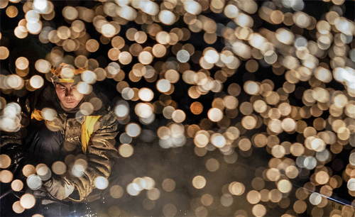 2019年1月15日凌晨,中鐵十一局施工人員在陜西省西安火車(chē)站改擴(kuò)建工程現(xiàn)場(chǎng)切割鋼軌。新華社記者陶明攝