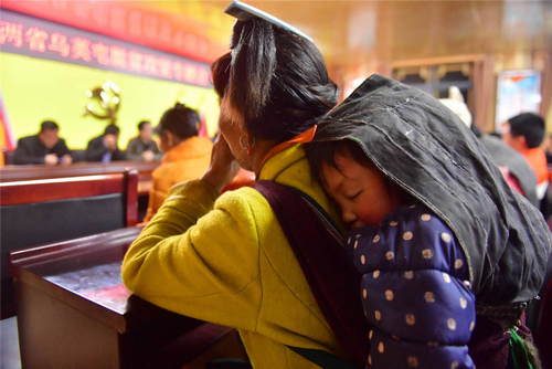 2019年3月14日,一名婦女背著小孩參加烏英苗寨脫貧產(chǎn)業(yè)會(huì)議。烏英苗寨位于桂黔交界的大苗山深處,共有140戶(hù)600多人,其中100戶(hù)屬?gòu)V西柳州市融水苗族自治縣桿洞鄉(xiāng)黨鳩村,40戶(hù)屬貴州省從江縣翠里瑤族壯族鄉(xiāng)南岑村。這里交通不便,土地資源匱乏,自然環(huán)境惡劣,曾經(jīng)是一個(gè)極度貧困的苗寨。2019年,全寨共有44戶(hù)貧困戶(hù)實(shí)現(xiàn)脫貧,貧困戶(hù)已從2016年的92戶(hù)減少到目前的4戶(hù)。新華社記者黃孝邦攝
