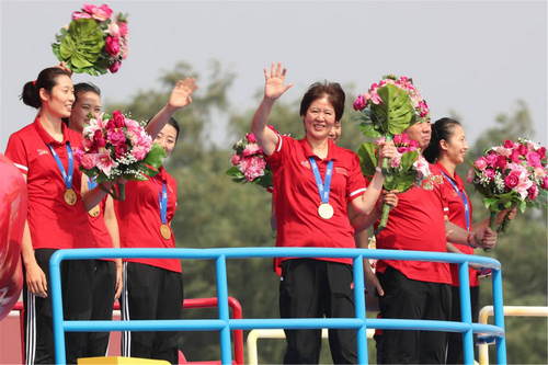 2019年10月1日,慶祝中華人民共和國(guó)成立70周年大會(huì)在北京天安門(mén)廣場(chǎng)隆重舉行。這是中國(guó)女排亮相“祖國(guó)萬(wàn)歲”彩車(chē)。新華社記者歐東衢攝