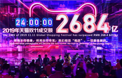 2019年11月12日,在浙江省杭州市阿里巴巴西溪園區(qū)媒體中心,大屏幕顯示阿里巴巴旗下天貓“雙十一”成交額超過(guò)2684億元。新華社記者黃宗治攝