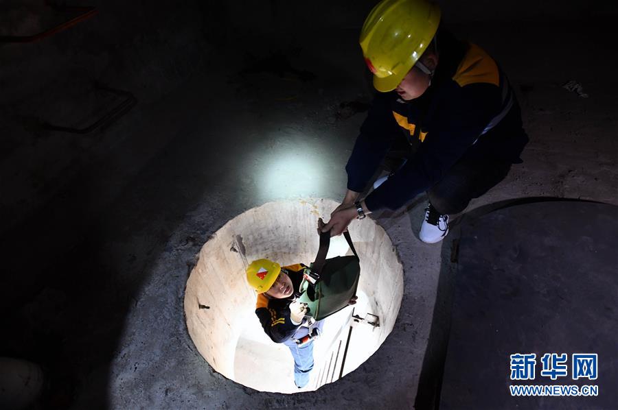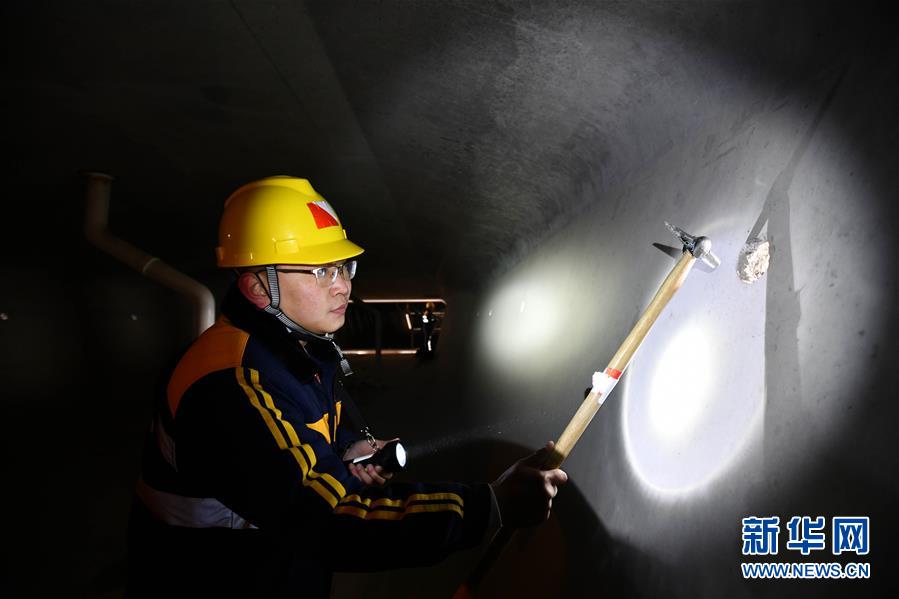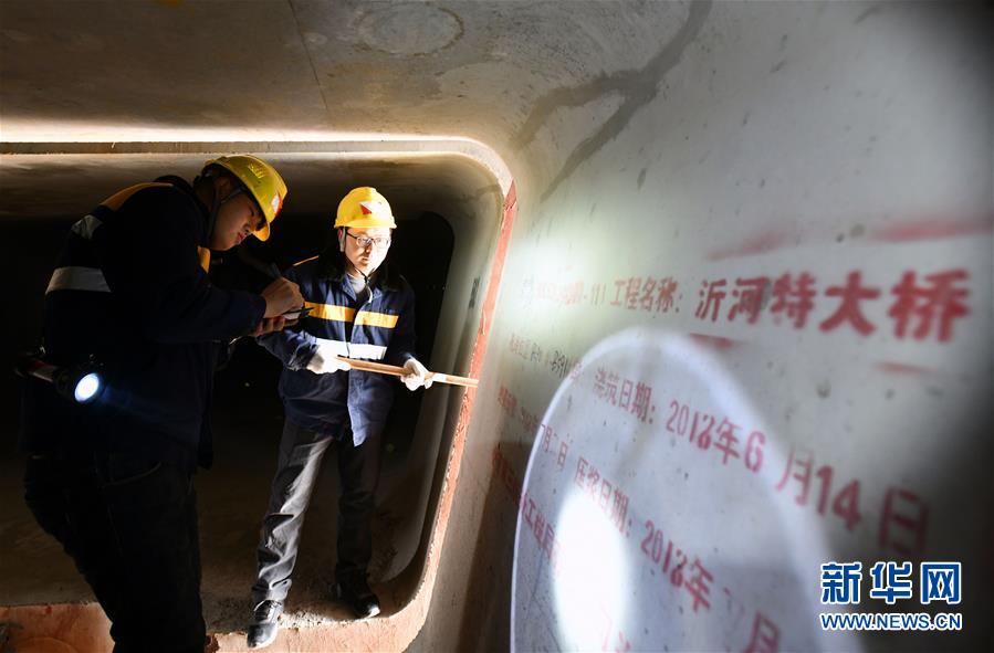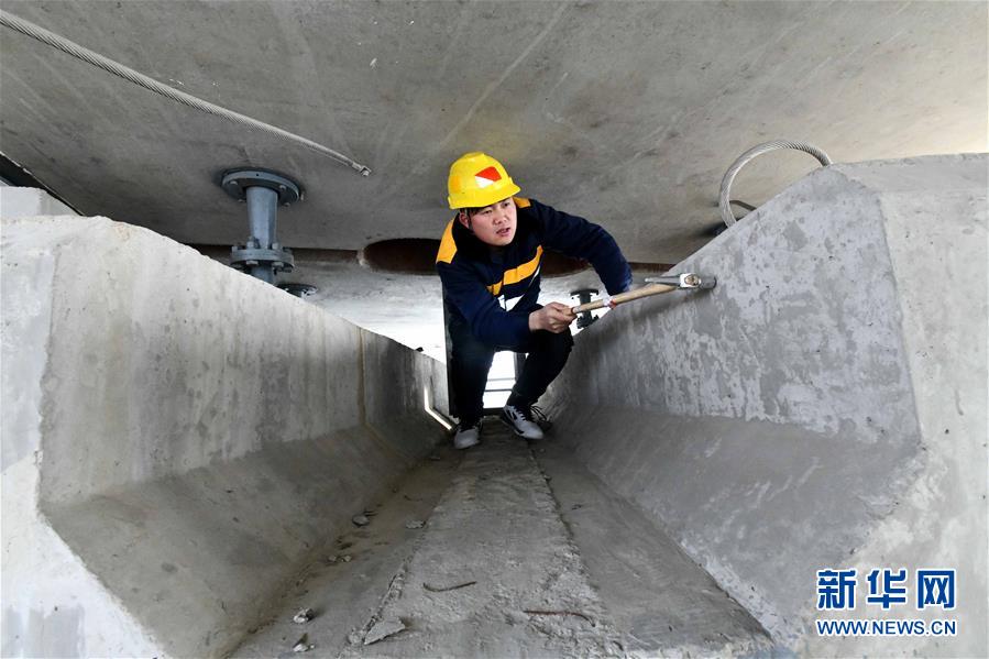 1月3日,中國(guó)鐵路濟(jì)南局臨沂工務(wù)段工程技術(shù)員在沂河特大橋箱梁內(nèi)檢查。新華社記者 朱崢攝