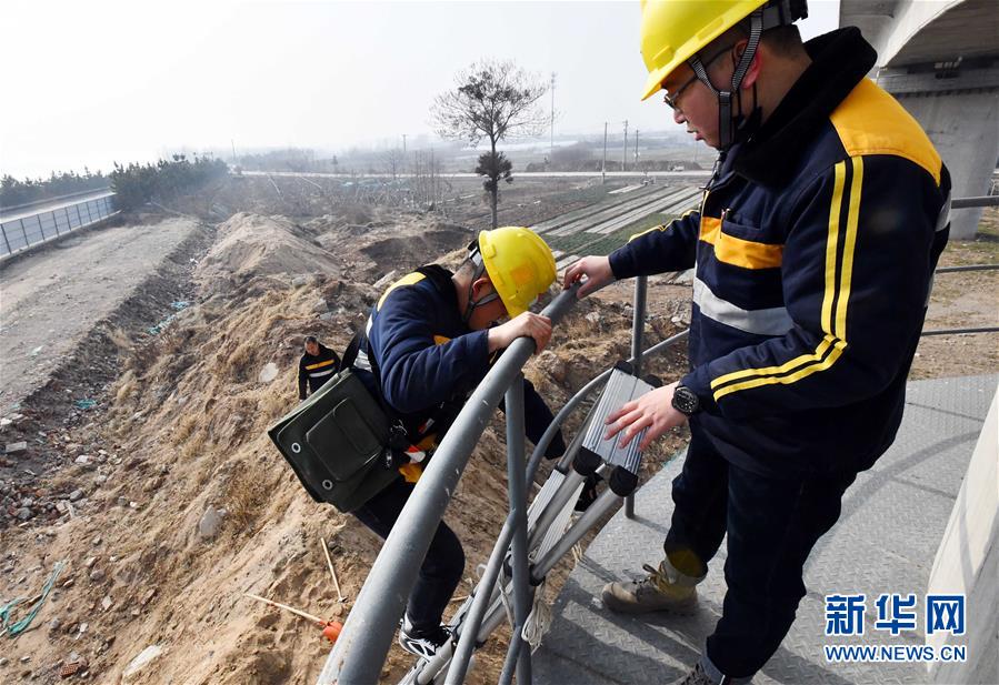1月3日,中國(guó)鐵路濟(jì)南局臨沂工務(wù)段工程技術(shù)員在沂河特大橋橋墩上檢查。新華社記者 朱崢攝