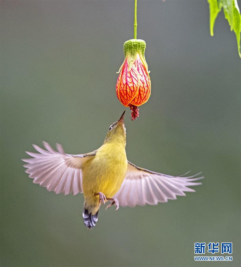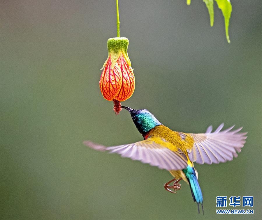 在福州市西湖公園,一只叉尾太陽鳥在狀如燈籠的懸鈴花前懸停、采蜜(1月3日攝)。  新華社記者梅永存攝
