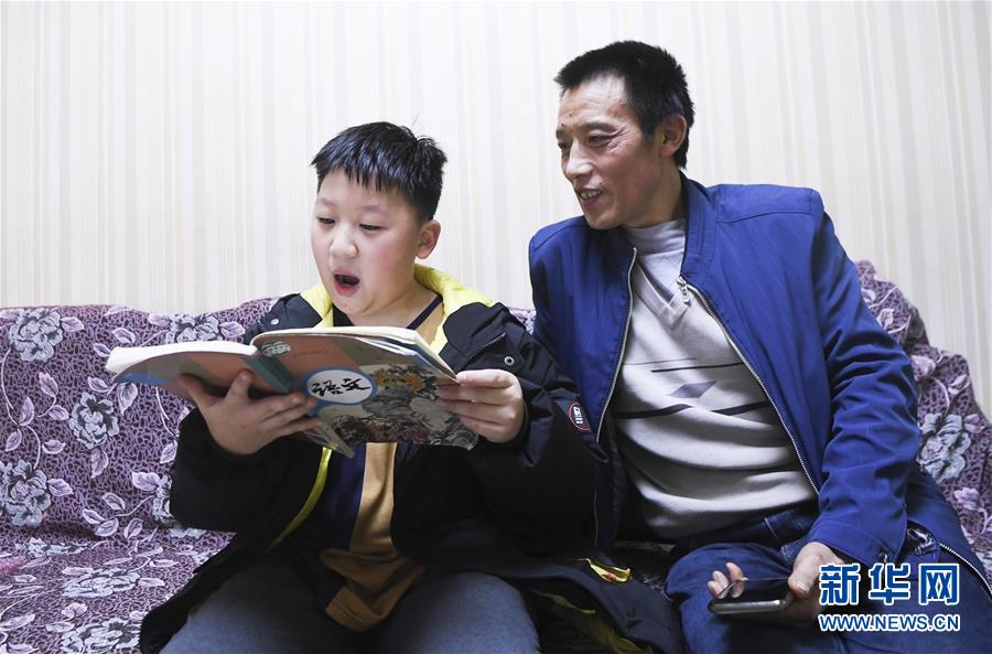 晚飯后,12歲的兒子冉俊超在家里朗誦課文,冉光輝在一旁聽(tīng)(1月5日攝)。新華社記者王全超攝
