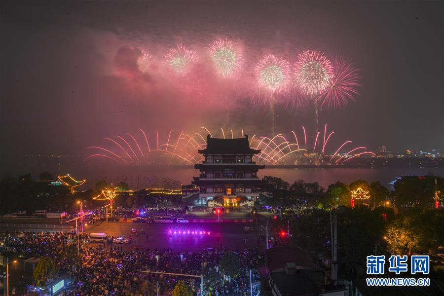 2020年1月1日晚,市民和游客在湖南長沙杜甫江閣前觀看焰火晚會。 當晚,湖南長沙在橘子洲舉行音樂焰火晚會慶祝元旦,吸引眾多市民和游客前往觀看。 新華社記者 陳澤國 攝