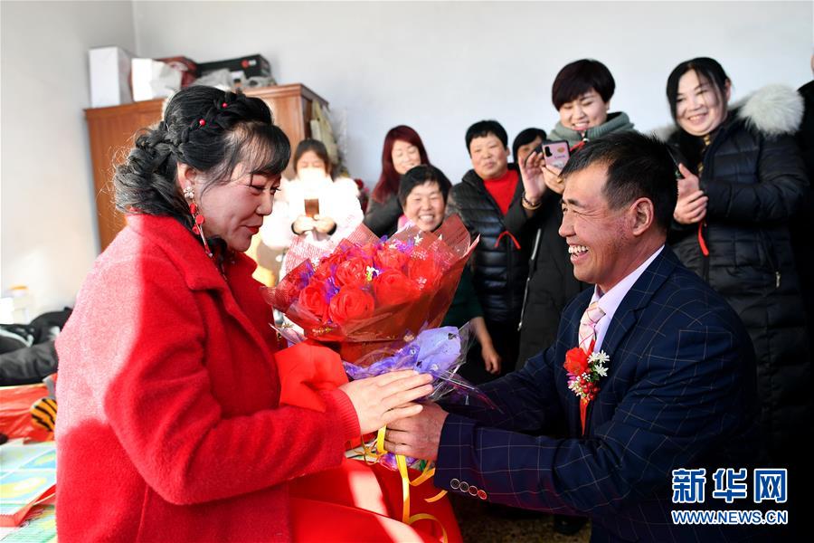 在和順縣李陽鎮(zhèn)南李陽村,新郎馬愛明將花送給新娘溫麗芳(2019年12月31日攝)。 農歷臘月初六,是山西省和順縣李陽鎮(zhèn)下石勒村45歲的馬愛明娶媳婦的日子。 地處太行山區(qū)的下石勒村曾深陷貧困,“地下無資源、地上沒產業(yè)”是這里的真實寫照。2013年,村里638口人中有511口屬貧困人口。村民在貧瘠的坡地上種的玉米、谷子等僅夠糊口,外村女子都不愿嫁到這里。和村里多數人一樣,貧困戶馬愛明不得不在農閑時出去打工補貼家用。東走走、西走走,馬愛明沒攢下錢,也沒遇見合適的人,婚事一拖再拖,成了大齡“光棍”。 2013年以來,在國家強有力的政策幫扶和基層黨組織的帶領下,下石勒村以合作社的形式發(fā)展起肉牛養(yǎng)殖、雙孢菇種植、萬壽菊種植等集體產業(yè)。下石勒村經濟有了起色,外出打工的村民紛紛回村。馬愛明加入了村里的建筑隊,閑時還到種植專業(yè)合作社打工,一年四季都有活干。加上土地流轉的收入,馬愛明一年能收入三萬多元。2016年,下石勒村實現整村脫貧。 2019年,馬愛明結識了在下石勒村肉雞養(yǎng)殖專業(yè)合作社打工的李陽鎮(zhèn)南李陽村村民溫麗芳,馬愛明的樸實、善良、勤勞打動了溫麗芳,兩人擦出了愛情的火花。 臘月初六這天,下石勒村鑼鼓喧天,嗩吶齊鳴。在鄉(xiāng)親們的見證下,馬愛明手牽新娘,大聲宣布:“我脫單了!我的幸福生活開始了!” 新華社記者 詹彥 攝