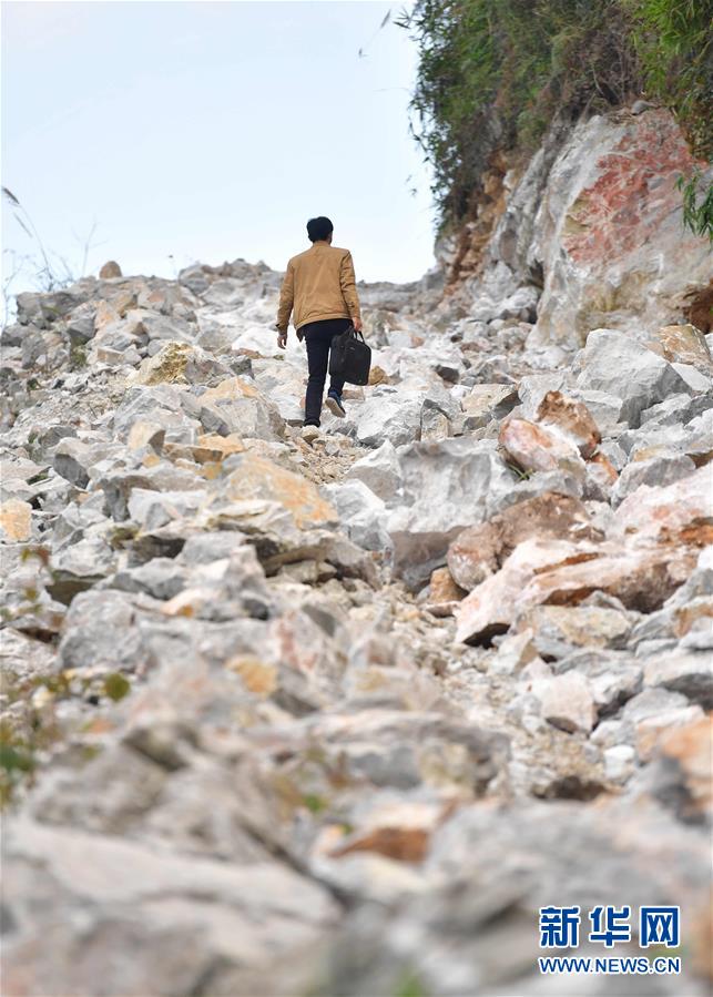 八好村駐村第一書記韋德王徒步前往弄麻屯開展扶貧工作,弄麻屯的公路尚在建設(shè)當中(2019年12月16日攝)。新華社記者黃孝邦攝