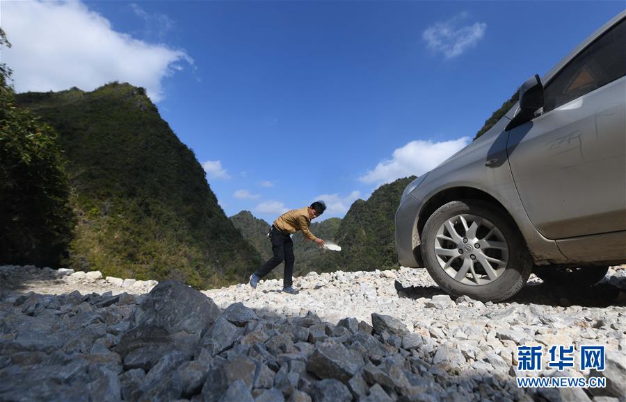 八好村弄豪屯的砂石路剛剛修通,碎石多、路況差,駐村第一書記韋德王駕車下屯途中,經(jīng)常要下車將大石塊搬走(2019年12月16日攝)。新華社記者黃孝邦攝