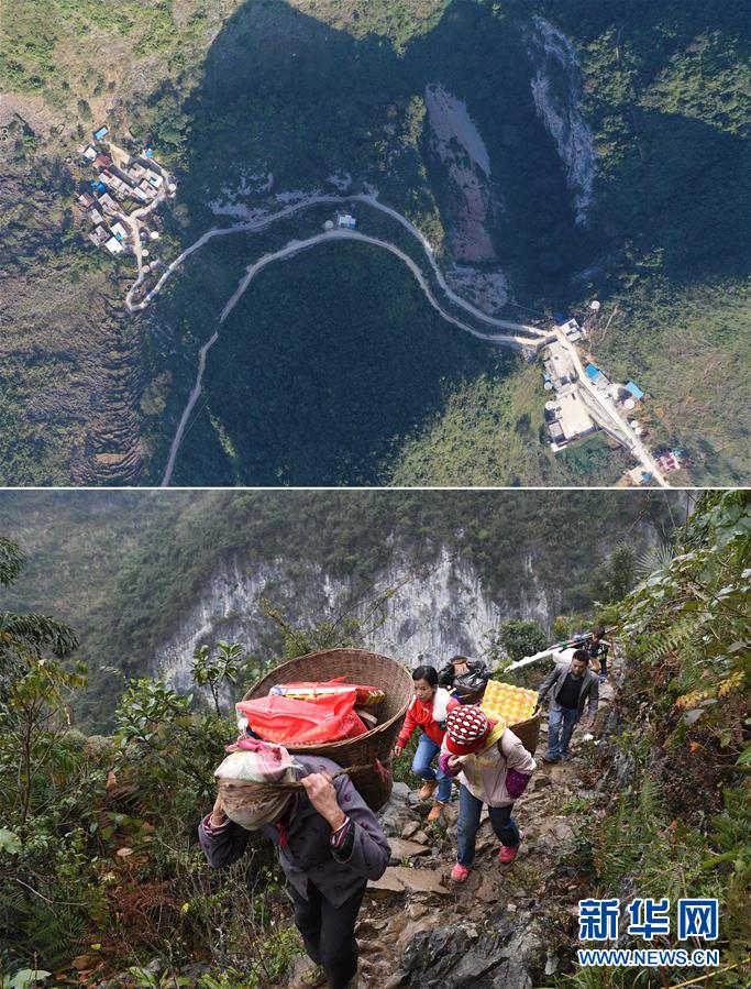 拼版照片:上圖為已經(jīng)修通水泥路的大化瑤族自治縣板升鄉(xiāng)八好村八好屯(2019年11月11日無人機拍攝);下圖為在尚未通路前,八好村八好屯村民背著年貨走山路回家(2016年1月26日攝)。新華社記者黃孝邦攝