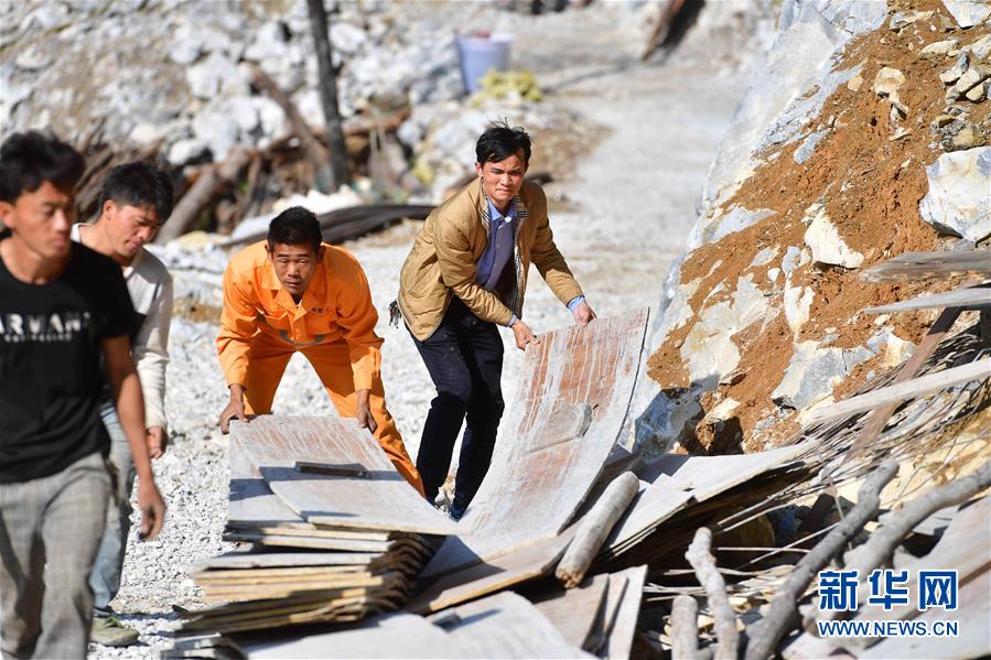 八好村駐村第一書記韋德王(右一)和群眾一起搬運木板,準備修建水柜(2019年12月16日攝)。新華社記者黃孝邦攝