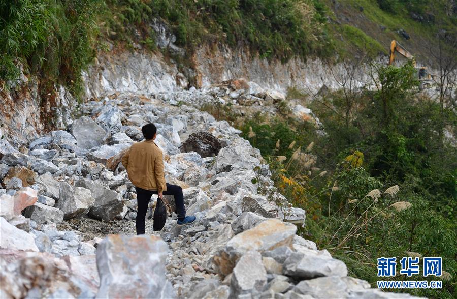八好村駐村第一書記韋德徒步前往弄麻屯開展扶貧工作,弄麻屯的公路尚在建設(shè)當中(2019年12月16日攝)。新華社記者黃孝邦攝