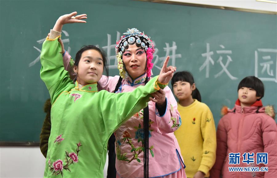 1月7日,定州市興定秧歌劇團演員在明月店鎮(zhèn)吳咬村小學(xué)指導(dǎo)學(xué)生練習(xí)戲曲表演基本功。 新華社記者 朱旭東 攝