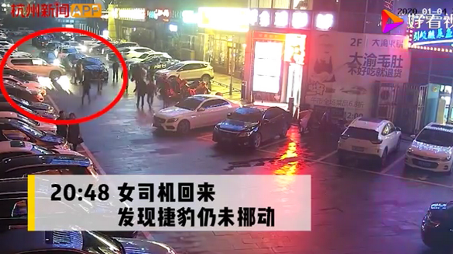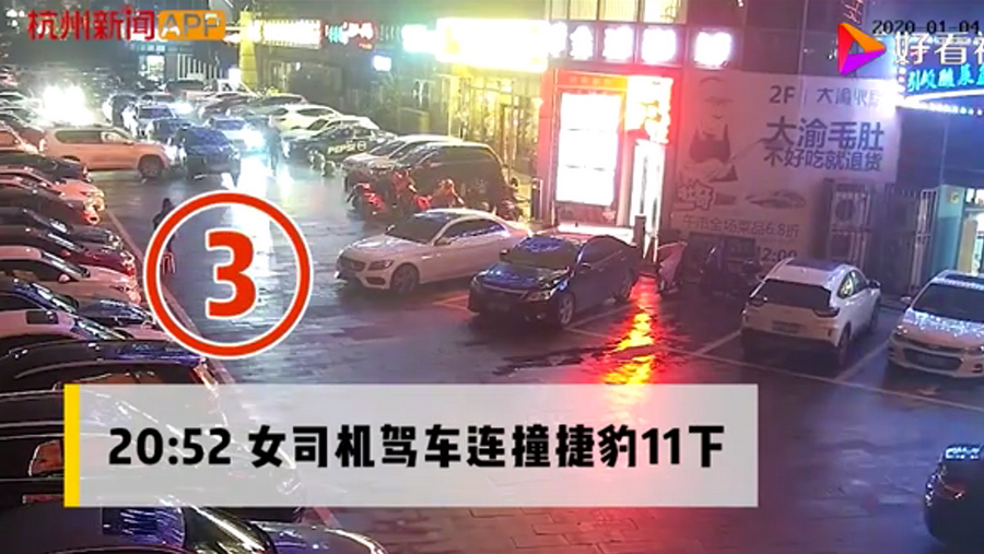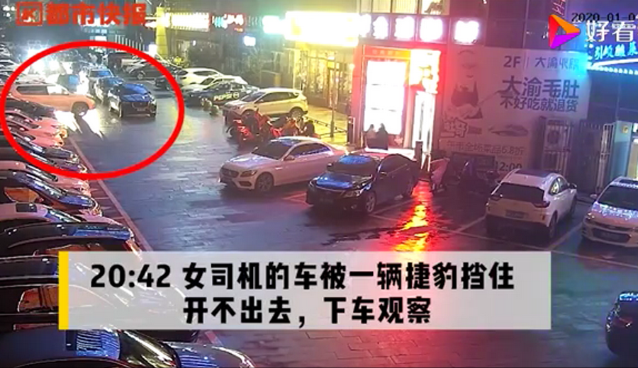 通過監(jiān)控發(fā)現(xiàn),捷豹車當(dāng)時并沒有停在停車位上,而是橫著停在停車位前的通道上,正好擋住了停在停車位里面的車輛。晚上8點40左右,一輛白色豐田普拉多越野車被捷豹擋住無法出去,10多分鐘后,司機通過倒車再加速十幾次撞擊捷豹,最終把車輛撞開后駛離現(xiàn)場。