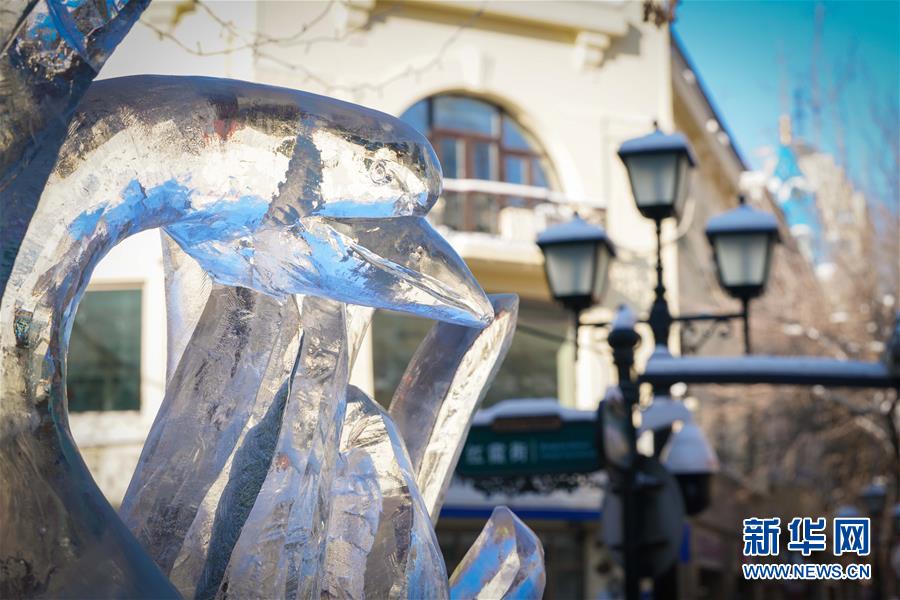 這是哈爾濱中央大街上的冰雕作品(1月1日攝)。新華社記者王松攝