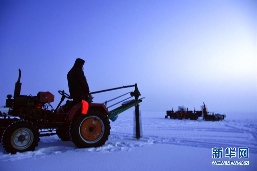 新疆福海縣漁民使用冰鉆在冰面打眼(1月5日攝)。新華社記者張曉龍攝
