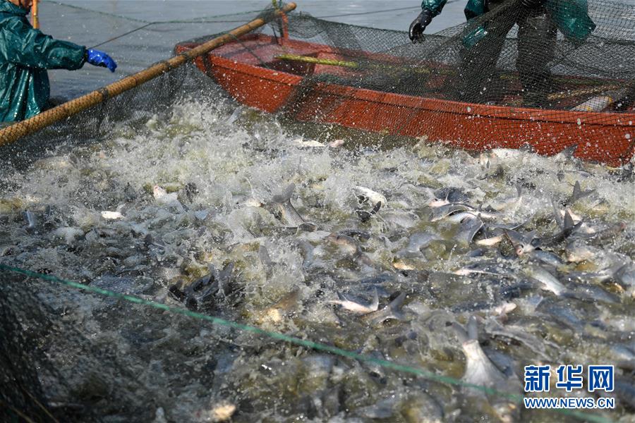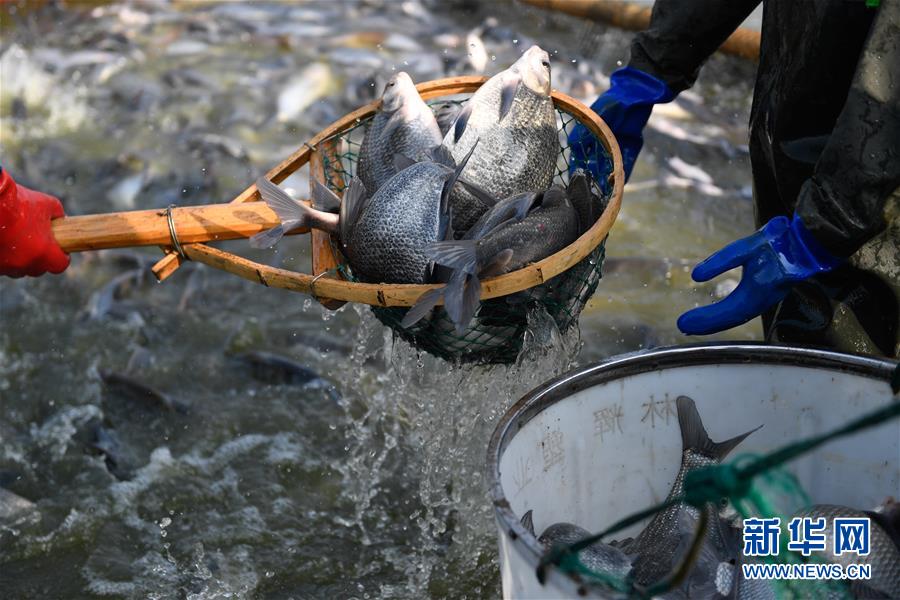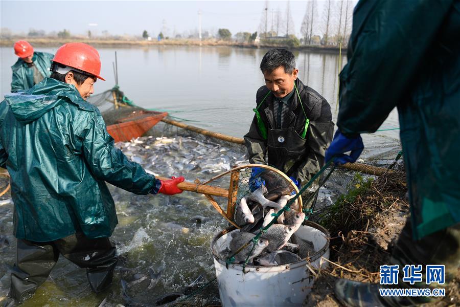 12月28日,漁民們?cè)诹夂?zhèn)盛江家庭農(nóng)場(chǎng)捕魚(yú)。新華社記者黃宗治攝
