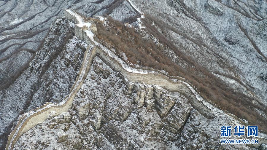 這是1月7日拍攝的北京箭扣長城雪景(無人機照片)。近日,北京迎來降雪天氣。雪后的箭扣長城內(nèi)外,惟余莽莽,蔚為壯觀。  新華社記者 陳曄華 攝