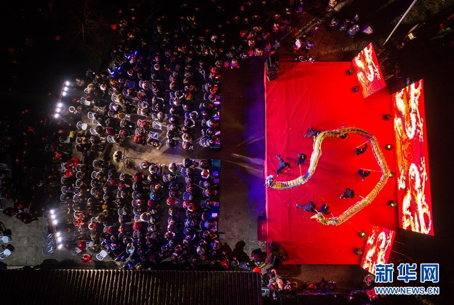 1月14日,杭州市余杭區(qū)中泰街道中橋村的文化公園內(nèi)在進(jìn)行“我們的村晚”舞龍表演,吸引了大批當(dāng)?shù)匕傩沼^看(無(wú)人機(jī)照片)。臨近春節(jié),浙江省杭州市余杭區(qū)中泰街道各村社的文化禮堂紛紛上演“我們的村晚”。老百姓自編、自導(dǎo)、自演為主的“土味”聯(lián)歡會(huì)因接地氣、親情濃而深受當(dāng)?shù)匕傩盏南矏?,成為?dāng)?shù)剜l(xiāng)村百姓的新年迎春“文化大餐”。近年來(lái),中泰街道以文化振興助推鄉(xiāng)村振興。目前,中泰街道下屬各村陸續(xù)建成文化禮堂7個(gè)、社區(qū)文化家園2個(gè),努力培育和挖掘出一批鄉(xiāng)土文化人才及原創(chuàng)作品,2019年全年開展各類鄉(xiāng)村社區(qū)惠民文體活動(dòng)累計(jì)180余場(chǎng)次。新華社記者徐昱攝