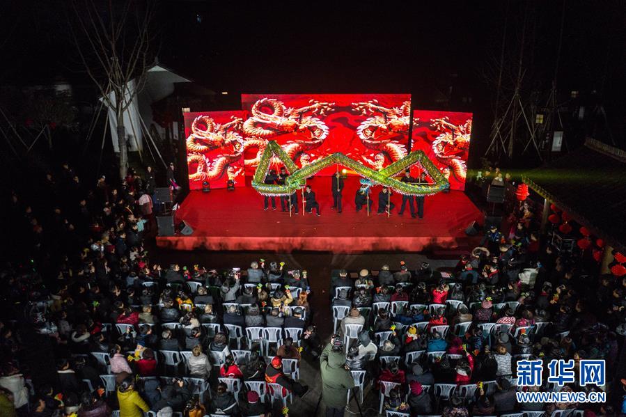 1月14日,杭州市余杭區(qū)中泰街道中橋村的文化公園內在進行“我們的村晚”舞龍表演,吸引了大批當地百姓觀看(無人機照片)。臨近春節(jié),浙江省杭州市余杭區(qū)中泰街道各村社的文化禮堂紛紛上演“我們的村晚”。老百姓自編、自導、自演為主的“土味”聯歡會因接地氣、親情濃而深受當地百姓的喜愛,成為當地鄉(xiāng)村百姓的新年迎春“文化大餐”。近年來,中泰街道以文化振興助推鄉(xiāng)村振興。目前,中泰街道下屬各村陸續(xù)建成文化禮堂7個、社區(qū)文化家園2個,努力培育和挖掘出一批鄉(xiāng)土文化人才及原創(chuàng)作品,2019年全年開展各類鄉(xiāng)村社區(qū)惠民文體活動累計180余場次。新華社記者徐昱攝