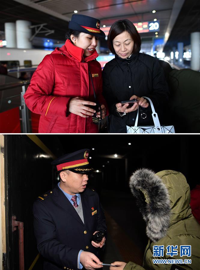 拼版照片上圖:在西安北站,列車長(zhǎng)陳海燕(左)幫助旅客在手機(jī)上購(gòu)買火車票(新華社記者詹彥1月11日攝);下圖:在陽(yáng)泉北站,列車長(zhǎng)趙耀(左)為旅客檢票(新華社記者楊晨光1月11日攝)。新華社發(fā)