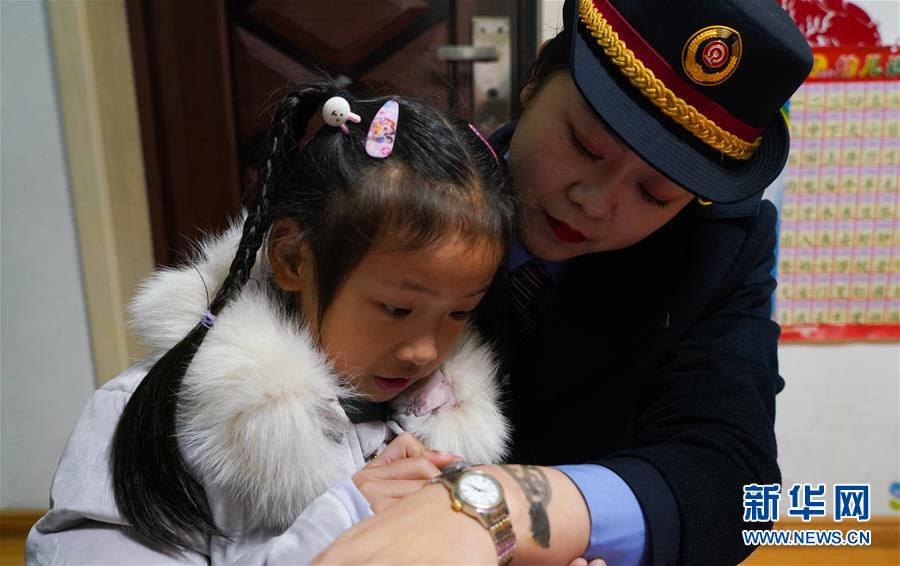 2020年1月3日晚,卞菁值乘從井岡山開往北京西的D734次列車,途經(jīng)南昌西站。思念媽媽的女兒朱梓芮在父親的陪同下,來(lái)到南昌西站站臺(tái)與卞菁團(tuán)圓,一家三口在站臺(tái)度過了8分鐘的團(tuán)聚時(shí)光。 在昏暗的站臺(tái),朱梓芮用水筆將媽媽手上略有些模糊的“手表”重新描繪清晰。隨著鈴聲響起,車門將一家人隔開,列車遠(yuǎn)去,一家人眼眶變得濕潤(rùn)起來(lái)……