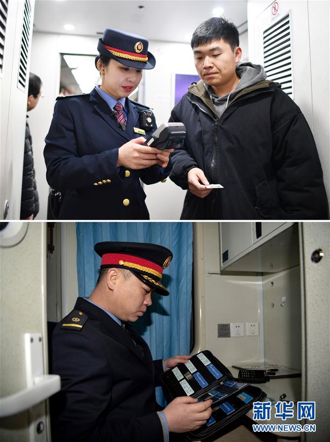 拼版照片上圖:在太原南開往西安北的D2507次列車上,列車長(zhǎng)陳海燕(左)幫助乘客辦理補(bǔ)票業(yè)務(wù)(新華社記者詹彥1月11日攝);下圖:在陽(yáng)泉北站,列車長(zhǎng)趙耀在查看臥鋪車票(新華社記者楊晨光1月11日攝)。新華社發(fā)
