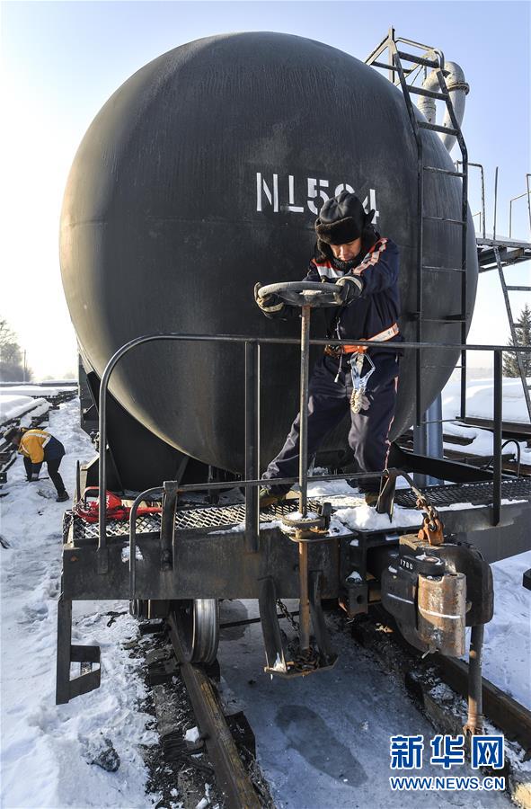 林海間的“送水小火車” 調車員對“送水小火車”進行出行前的檢查作業(yè)(1月17日攝)。新華社記者 許暢 攝