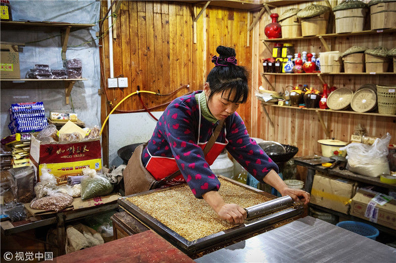 重慶江津區(qū)中山古鎮(zhèn)第十四屆 “千米長宴”民俗文化節(jié)盛大啟幕。上午10時,中山古鎮(zhèn)老街人聲鼎沸,窄窄的青石板路打掃得干干凈凈,家家戶戶門口掛起喜慶的紅燈籠,老商鋪門口擺滿了米酒、烤糍粑、煙熏豆腐……此次“千米長宴”以“絲路情緣,‘?!现猩健睘橹黝}。“千米長宴”期間,游客們不僅可以一雙筷子吃遍全街,還可欣賞到祈福祭祀、民俗拜年、“打盆上菜”等表演,同時還增設了以唱、跳、講故事的上菜方式情景演繹愛情主題的文化餐飲,展示富硒愛情宴的文化內涵。圖為街坊們在頭天就開始準備各種菜肴與小吃。