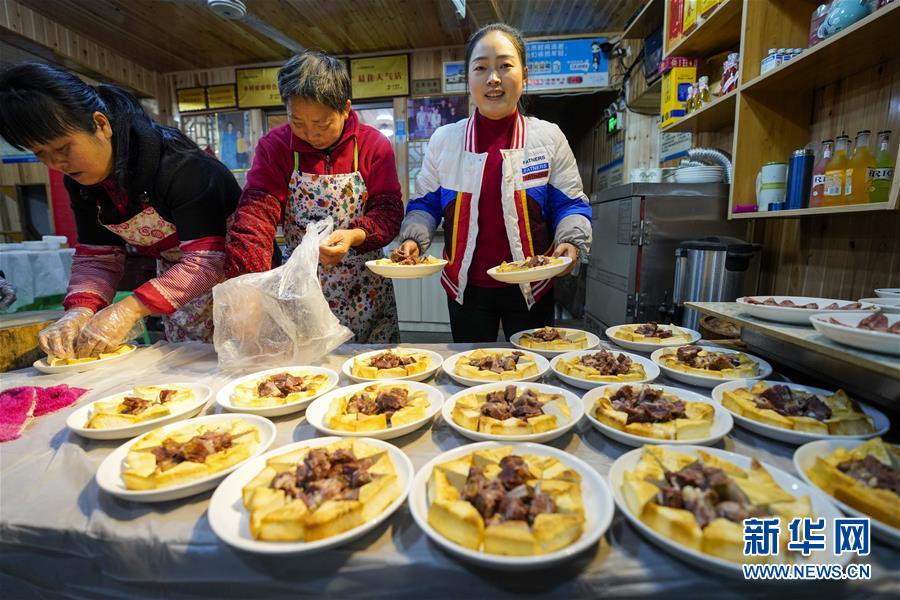 1月18日,在中山古鎮(zhèn)的“千米長宴”上,民間藝人用古鎮(zhèn)傳統(tǒng)“打盆”絕藝給游客們上菜。當日中午,伴隨著一聲“開席嘍”,一年一度的“千米長宴”在重慶市江津區(qū)中山古鎮(zhèn)舉行。噴香的煙熏豆腐、軟糯的夾燒肉、可口的石板糍粑……800余桌年味十足的特色美食,吸引了兩萬多名游客前來體驗傳統(tǒng)民俗,感受“一雙筷子吃遍一條街”的暢快淋漓。中山古鎮(zhèn)自古就有“千米匯長宴萬人祈福祉”的習俗。每年春節(jié)期間,古鎮(zhèn)老街居民都會在千米長街上大擺“百家宴”,祝福生意興隆、家業(yè)興旺、風調雨順、五谷豐登。新華社記者劉潺攝
