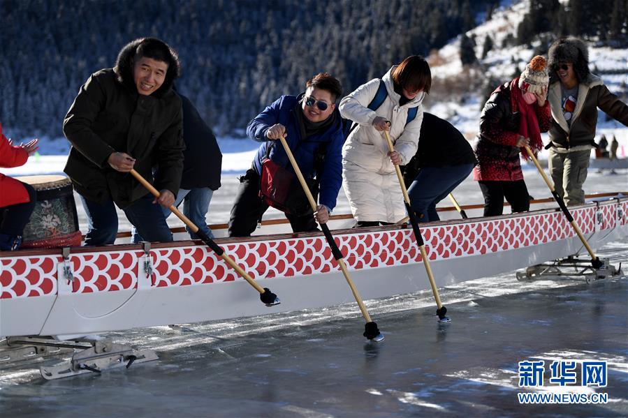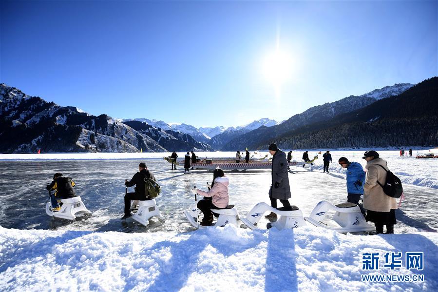 1月18日,游客在新疆天池景區(qū)玩冰上龍舟。新華社記者 沙達提 攝